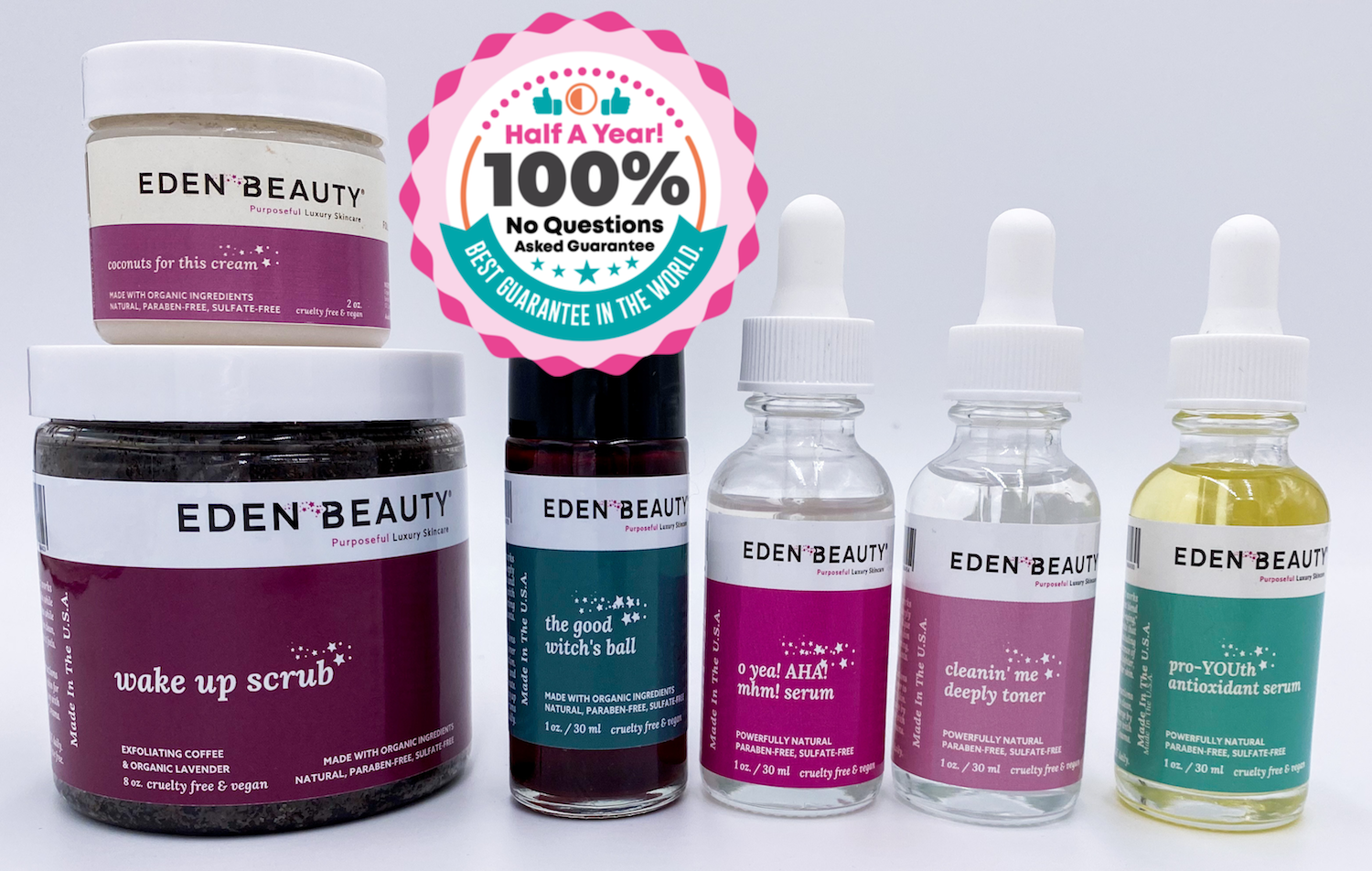 Every single Eden Beauty product comes with a 100% money-back guarantee, that lasts for a full 180 days (that’s 6 months… that’s half a year!).